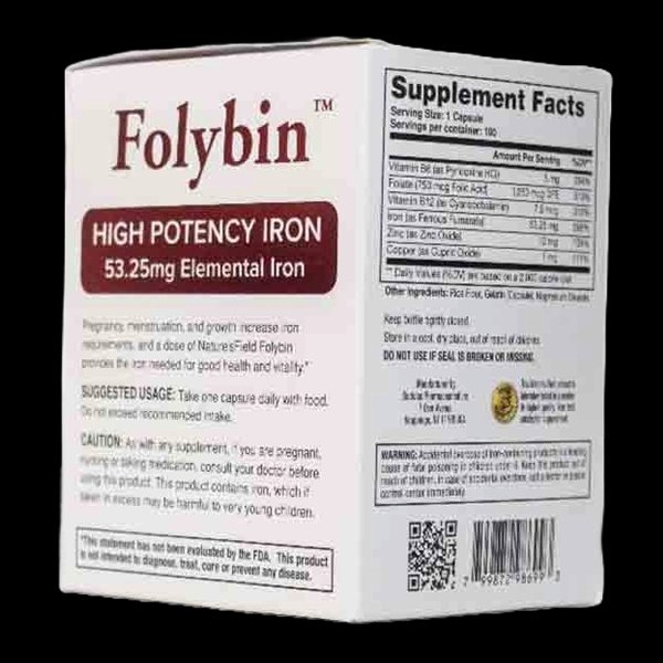 Nature’sField Folybin is a high potency Iron supplement that increases energy levels, improves immune function, and supports the production of healthy red blood cells. It also corrects nutritional deficiency in people that have iron-deficiency anemia
